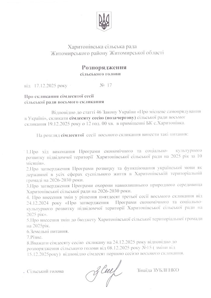 Запрошуємо Вас на засідання сімдесятої сесії восьмого скликання, яка відбудеться 19 грудня 2025 року о 12:00 год в приміщенні будинку культури с.Харитонівка.