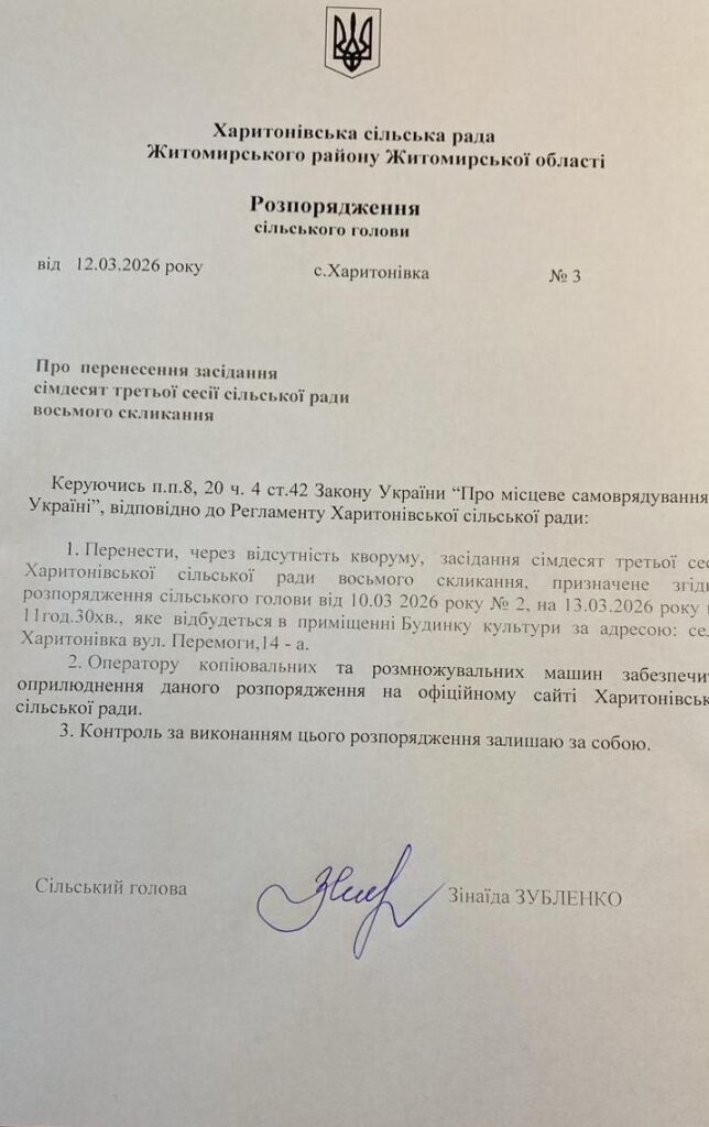 Запрошуємо Вас на засідання сімдесят третьої сесії восьмого скликання, яка відбудеться 13 березня 2026 року о 11:30 год в приміщенні Будинку культури Харитонівської сільської ради за адресою: с. Харитонівка, вул Перемоги, 14-а.