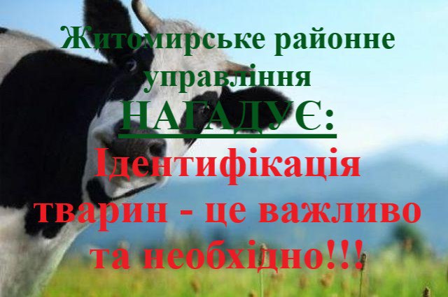 Житомирське районне управління Головного управління Держпродспоживслужби в Житомирській області інформує, шо реєстрація тварин є частиною державної політики України, що приводить законодавство України у відповідність до законодавства Європейського Союзу та впроваджується на державному рівні в галузі тваринництва і є обов’язковою для господарств всіх форм власності.