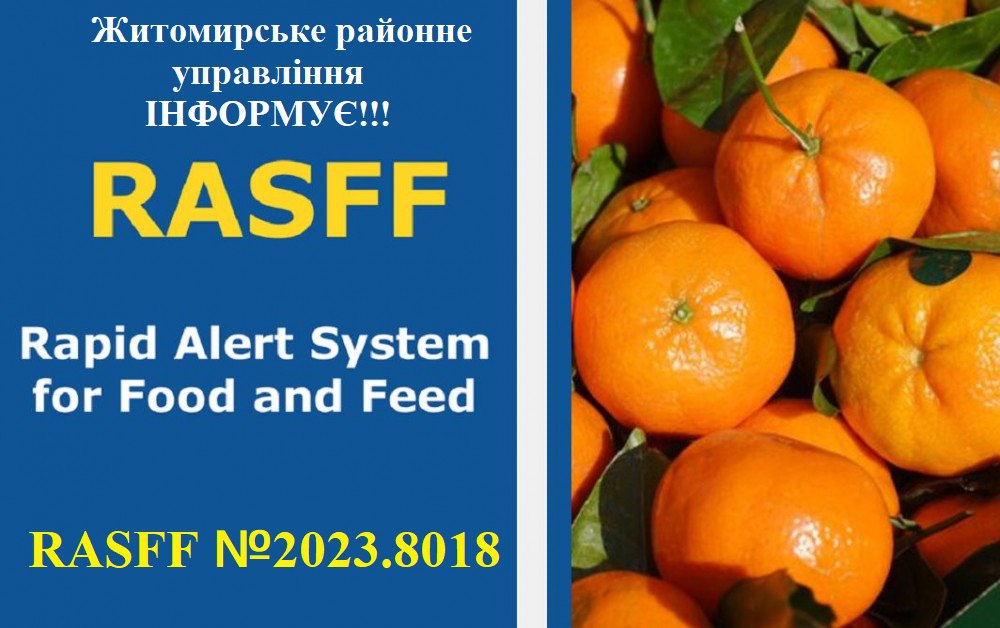 Житомирське районне управління Головного управління Держпродспоживслужби в Житомирській області повідомляє, що відповідно до листа Державної служби України з питань безпечності харчових продуктів та захисту споживачів від 21 листопада 2023 року № 11.1.3-21/24468 надійшло інформаційне повідомлення, отримане по системі швидкого оповіщення щодо харчових продуктів та кормів (RASFF) від 20 листопада 2023 року № 2023.8018 стосовно виявлення диметоату в мандаринах з Єгипту, що експортувались з Греції (експортрер: DROSERO TRADE S.M. P.C., Giannitsa) до України (отримувач: ТОВ «Фудком», вул. Залізничне шосе 57, м. Київ, 01014; місце доставки: с. Мартусівка, Бориспільський р-н., Київська обл.).
