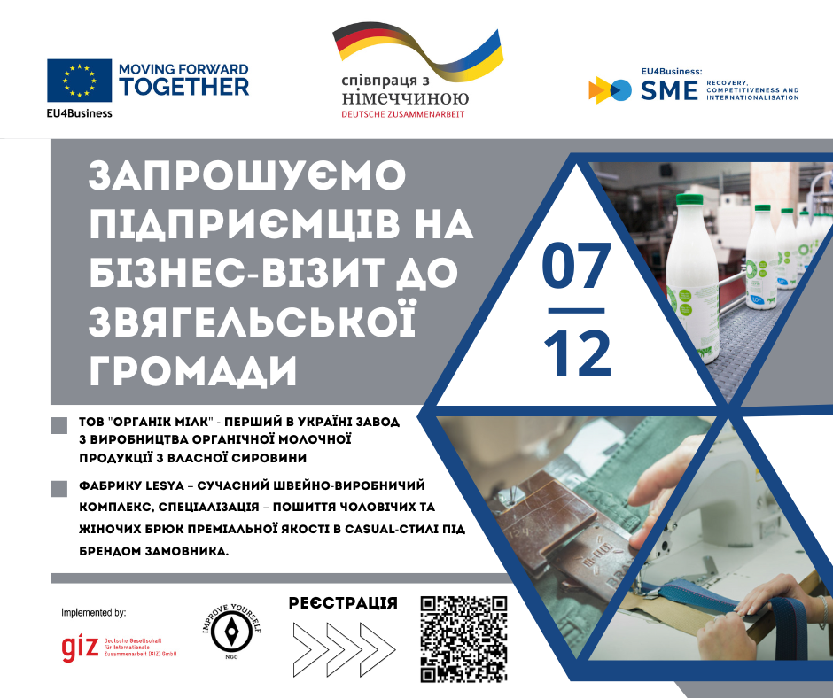 ГО “Вдоскональ себе” запрошує представників малого та середнього бізнесу Житомира та області на навчально-консультаційний бізнес-візит до підприємств Звягельської громади, який відбудеться 7 грудня 2023 року. У рамках проєкту «Спроможний бізнес – спроможна країна» за підтримки EU4Business планується відвідування трьох місцевих підприємств, які є прикладом успішної підприємницької діяльності.