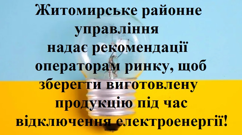 З огляду на ситуацію, яка складається через віялові відключення систем енергопостачання, Житомирське районне управління Головного управління Держпродспоживслужби в Житомирській області рекомендує операторам ринку: