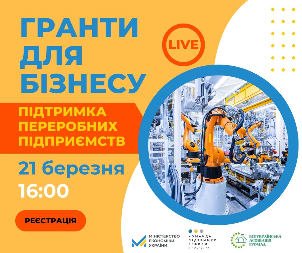 Всеукраїнська асоціація громад запрошує на вебінар: “Гранти для бізнесу. Підтримка переробних підприємств”