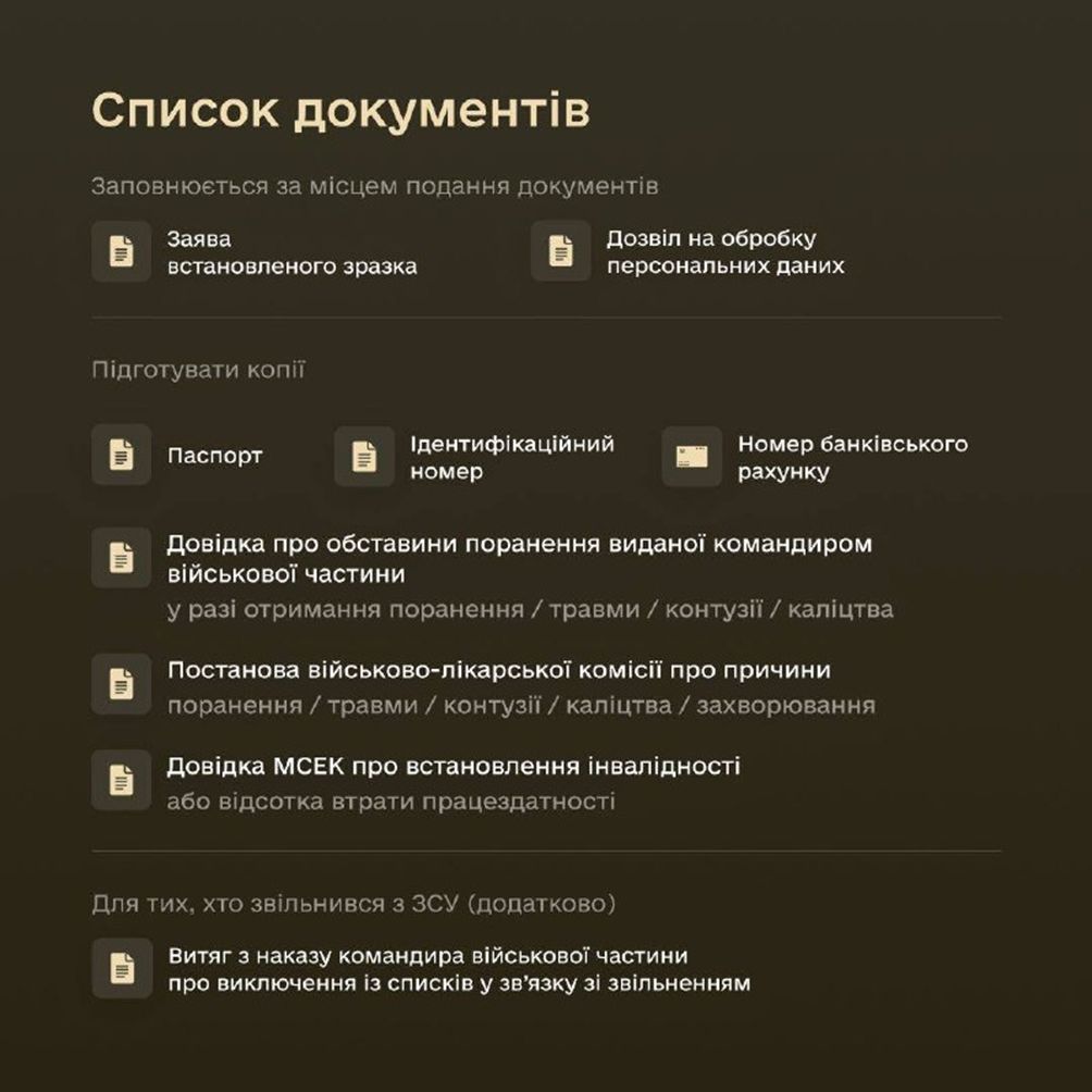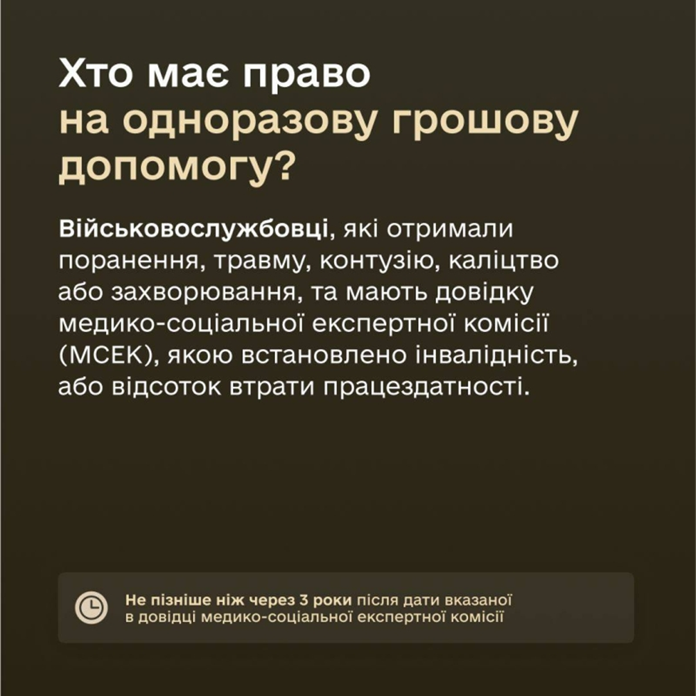 На одноразову грошову допомогу (ОГД) мають право військовослужбовці, які отримали поранення, травму, контузію, каліцтво або захворювання, та мають довідку медико-соціальної експертної комісії (МСЕК), якою встановлено інвалідність, або відсоток втрати працездатності.