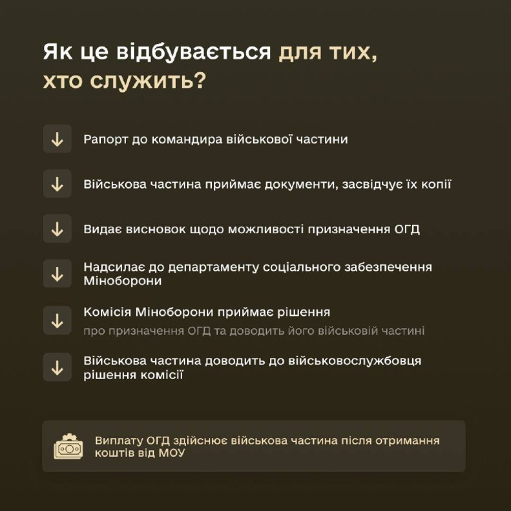 Тим, хто служить, потрібно подати відповідний рапорт до командира військової частини. Після цього військова частина приймає документи та засвідчує їх копії, видає висновок щодо можливості призначення ОГД, а потім надсилає до департаменту соціального забезпечення Міноборони. Комісія Міноборони ухвалює рішення про призначення ОГД та доводить його військовій частині. В свою чергу, військова частина доводить до військовослужбовця рішення комісії та здійснює виплату ОГД після отримання коштів від Міноборони.