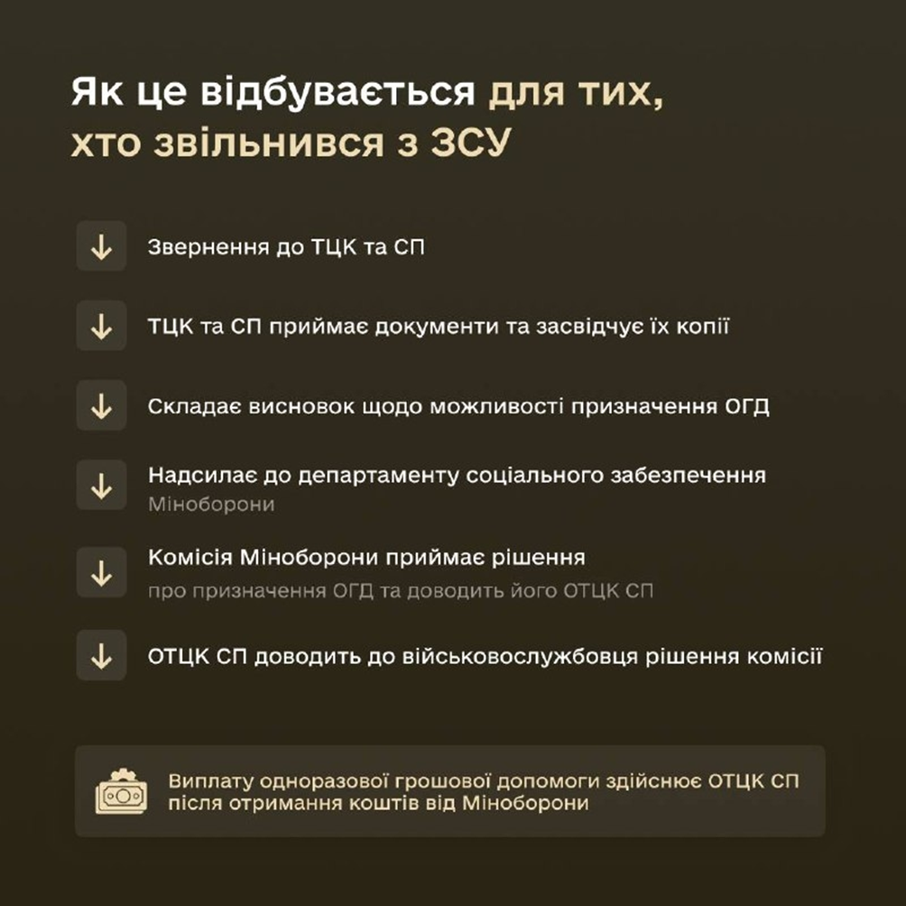 Тим, хто звільнився зі ЗСУ, потрібно звернутися до ТЦК та СП, де військовослужбовець перебуває на обліку. ТЦК та СП приймає документи та засвідчує їх копії і складає висновок щодо можливості призначення ОГД, який надсилається до департаменту соціального забезпечення Міноборони. Комісія Міноборони ухвалює рішення про призначення ОГД та доводить його ОТЦК та СП. В свою чергу, ОТЦК та СП доводить до військовослужбовця рішення комісії та здійснює виплату після отримання коштів від Міноборони.