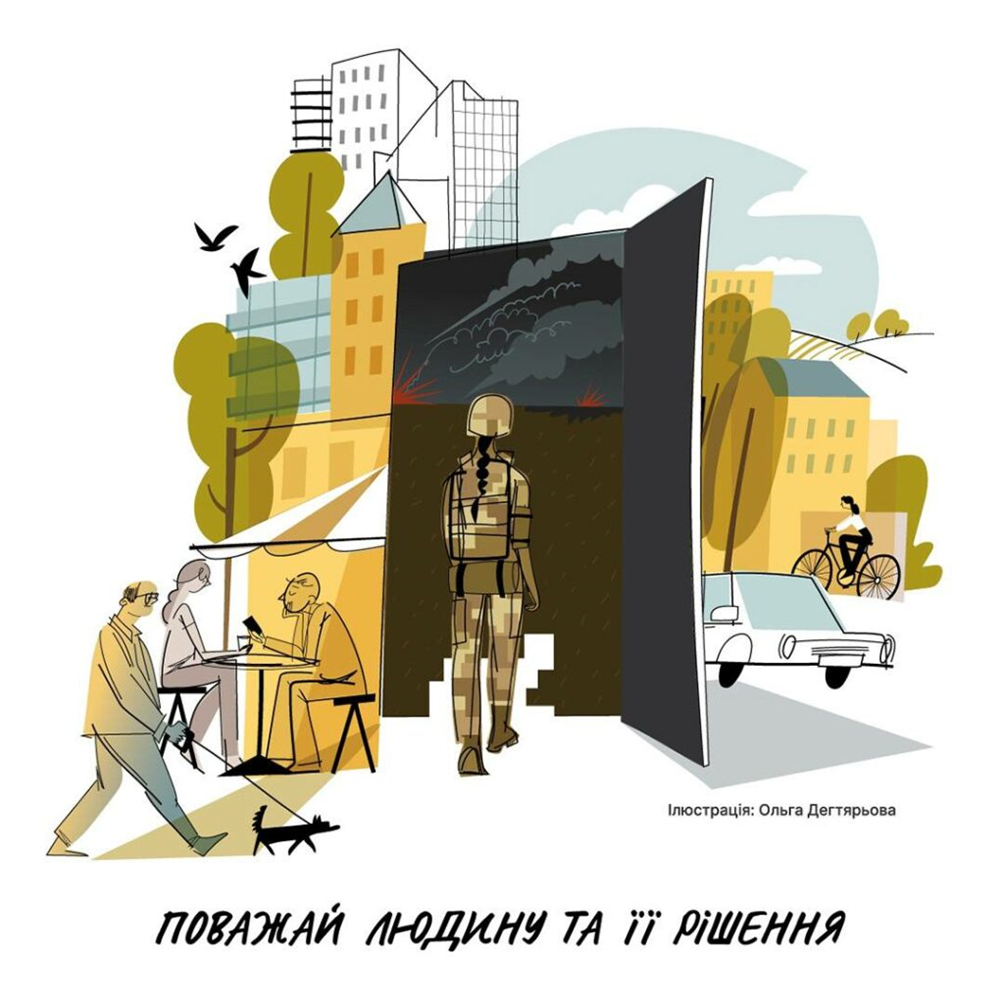 Довідково. Цикл ілюстрацій «Досвід ветеранів вартий поваги» створила Ольга Дегтярьова спеціально для тематичної хвилі «Досвід ветеранів вартий поваги» комунікаційної кампанії «Ти як?» Всеукраїнської програми ментального здоров’я – ініціативи першої леді Олени Зеленської.