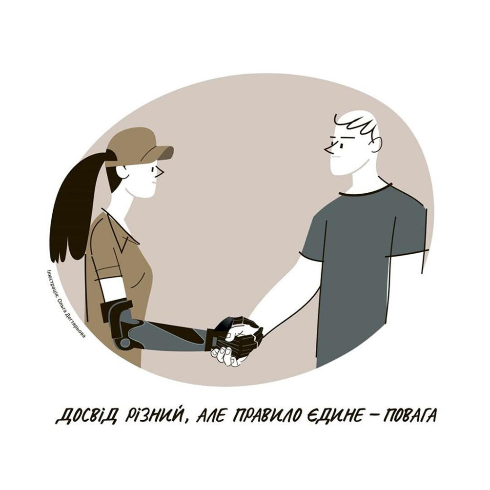 Художниця Ольга Дегтярьова створила прості та чудові ілюстрації, які надихають виказувати вдячність і солідарність ветеранам. Ділимося з вами, щоб і ви могли поширювати їх. Та ширити усвідомлення про те, як необхідно бути поруч, бути разом.