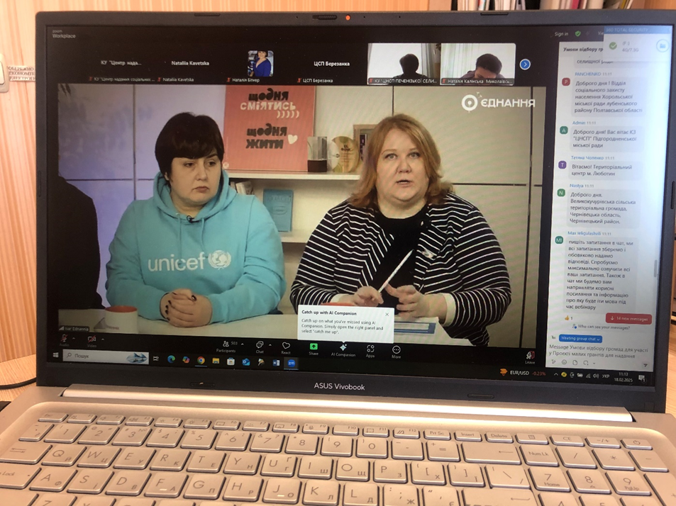 У вівторок, 18 лютого 2025 року працівники комунальної установи «Центр надання соціальних послуг» Харитонівської сільської ради, взяли участь у вебінарі : «Умови відбору громад для участі у Проєкті малих грантів для надання соціальних послуг сім’ям з дітьми та дітям та/або послуги раннього втручання». Мета вебінару – можливість отримати детальну інформацію про процедури Проєкту малих грантів для надання соціальних послуг сім’ям з дітьми та дітям та/або послуги раннього втручання.