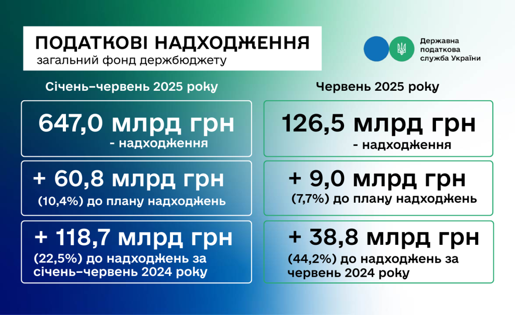+10,4 % (60,8 млрд грн) – до плану надходжень за січень – червень 2025 року;