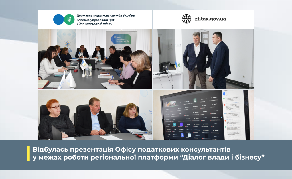 В рамках регіональної платформи «Діалог влади та бізнесу» сьогодні в Головному управлінні ДПС у Житомирській області відбулася презентація діяльності нового інструменту підтримки бізнесу та громадян – Офісу податкових консультантів.