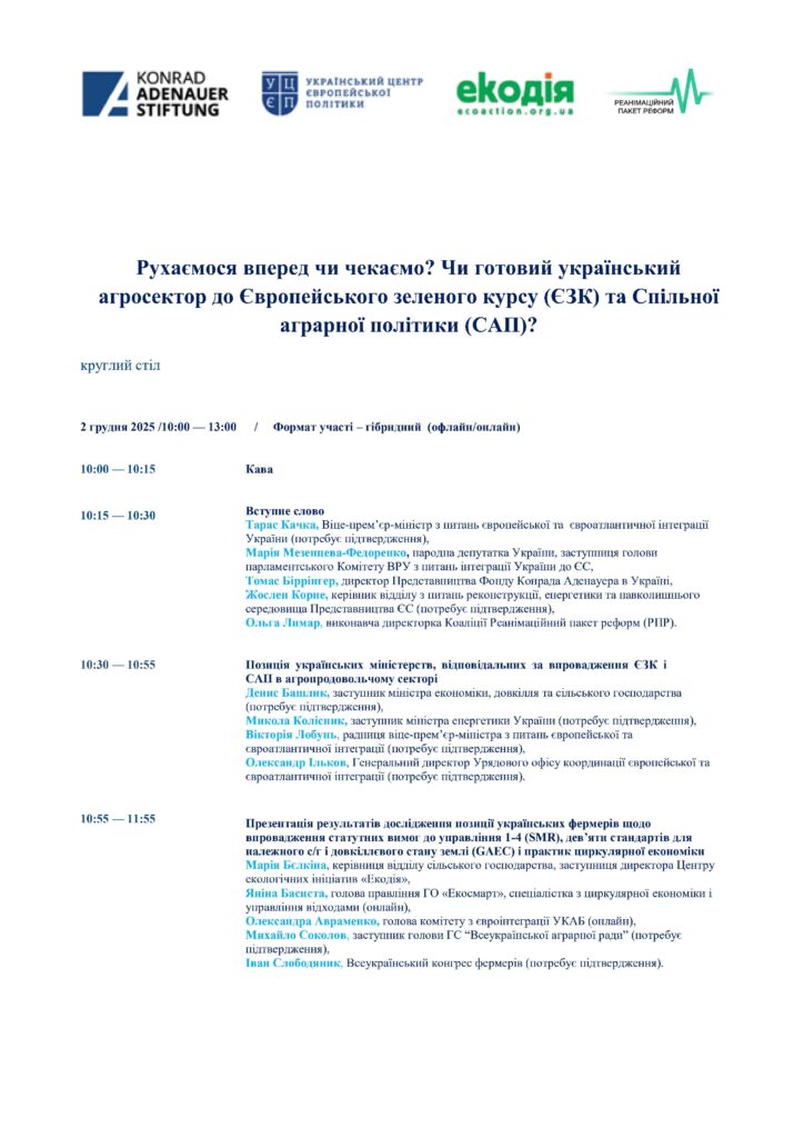 Основний акцент події — презентація консолідованих позицій понад 500 малих і середніх фермерів щодо готовності до впровадження вимог кліматичної та довкіллєвої політики ЄС, що може дати додаткові обгрунтування до переговорної позиції. Також окремо будуть представлені рекомендації щодо створення процедури підтвердження відповідності