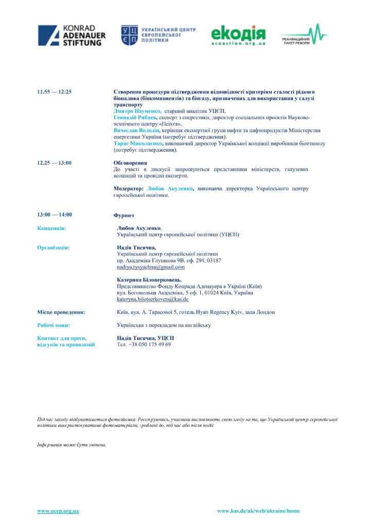 Організовує ГО «Український центр європейської політики» (УЦЄП) спільно з Підкомітетом з питань наближення законодавства України до законодавства ЄС комітету ВРУ з питань інтеграції України до ЄС, Центром екологічних ініціатив «Екодія» за підтримки Представництва Фонду Конрада Аденауера в Україні.