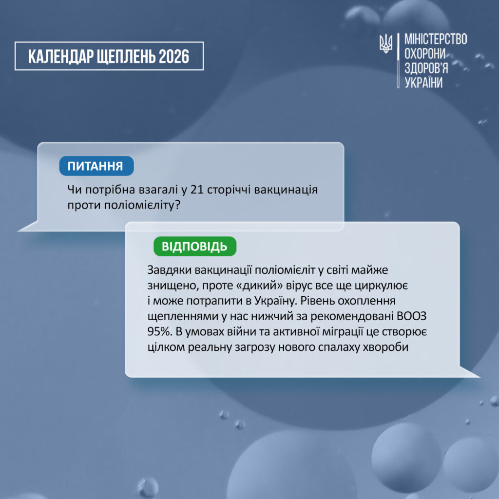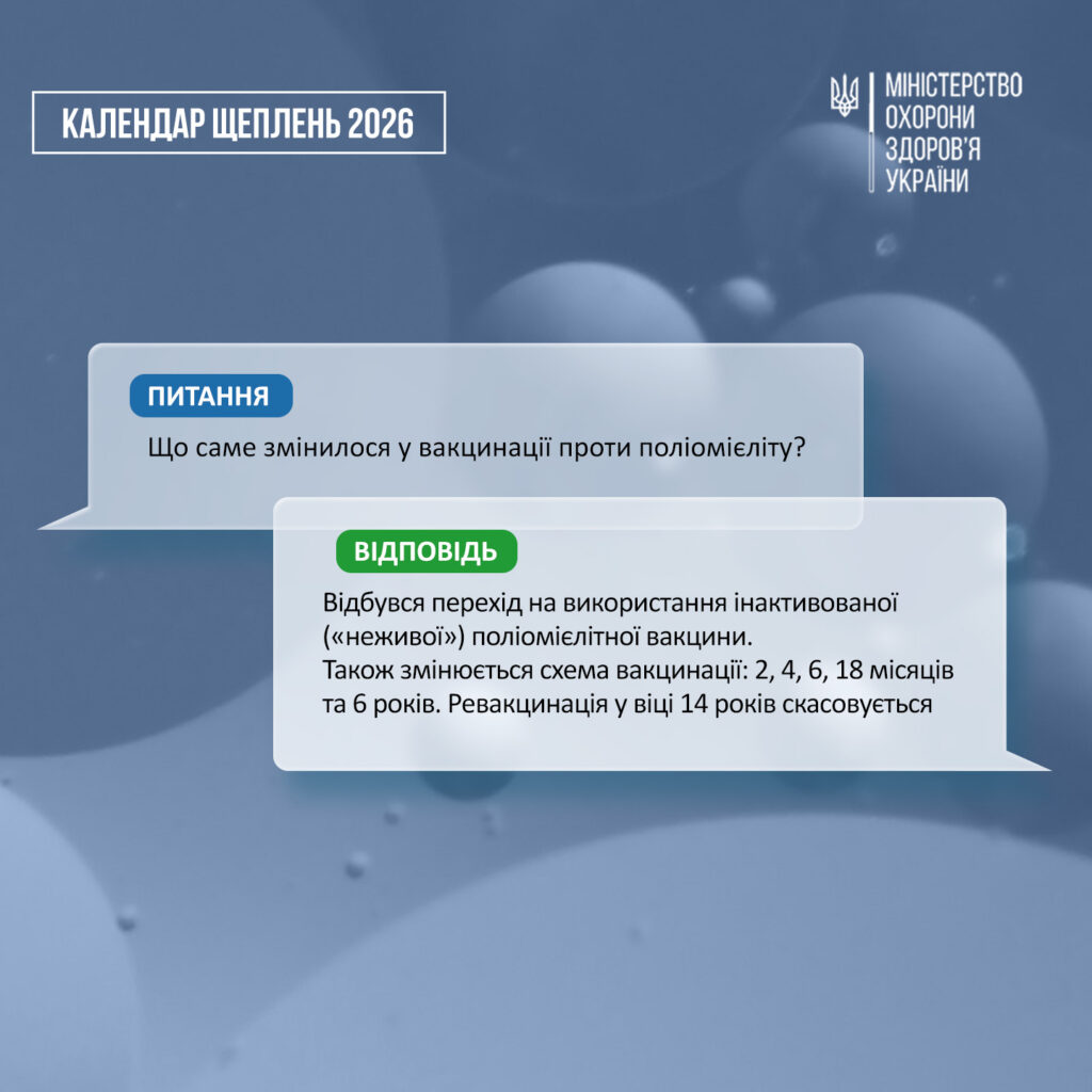 💬 Відбувся перехід на використання інактивованої («неживої») поліомієлітної вакцини, оральна поліомієлітна вакцина (ОПВ) більше не застосовуватиметься.