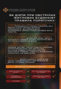 – у разі потрапляння у район обстрілу – сховатись у найближчу захисну споруду цивільної оборони, сховище (укриття). У разі відсутності пристосованих сховищ, для укриття використовувати нерівності рельєфу (канави, окопи, заглиблення від вибухів тощо). У разі раптового обстрілу та відсутності поблизу споруд цивільного захисту, сховища і укриття − ляжте на землю головою в бік, протилежний вибухам. Голову слід прикрити руками (за наявності для прикриття голови використовувати валізу або інші речі). Не виходьте з укриття до кінця обстрілу;