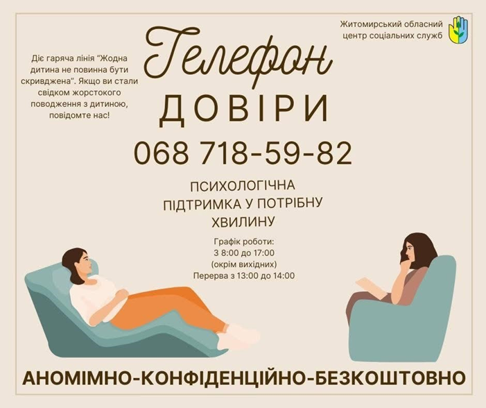Житомирський обласний центр соціальних служб пропонує анонімну допомогу через телефон довіри. Тут працюють кваліфіковані фахівці, готові вислухати ваші переживання, надати емоційну підтримку та допомогти знайти рішення.