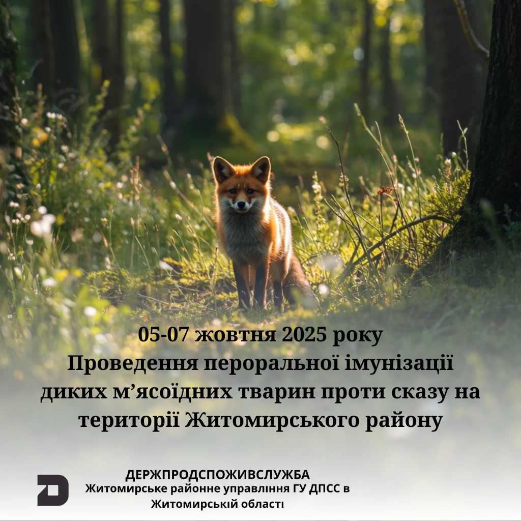 Житомирське районне управління Головного управління Держпродспоживслужби в Житомирській області повідомляє, що на території Житомирського району з 05 по 07 жовтня 2025 року заплановано проведення пероральної імунізації диких м’ясоїдних тварин проти сказу.