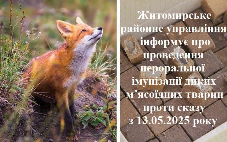 Житомирське районне управління Головного управління Держпродспоживслужби в Житомирській області повідомляє, що на території Коростишівської, Старосілецької та Харитонівської ОТГ з 13 травня 2025 року заплановано проведення пероральної імунізації диких м’ясоїдних тварин проти сказу.